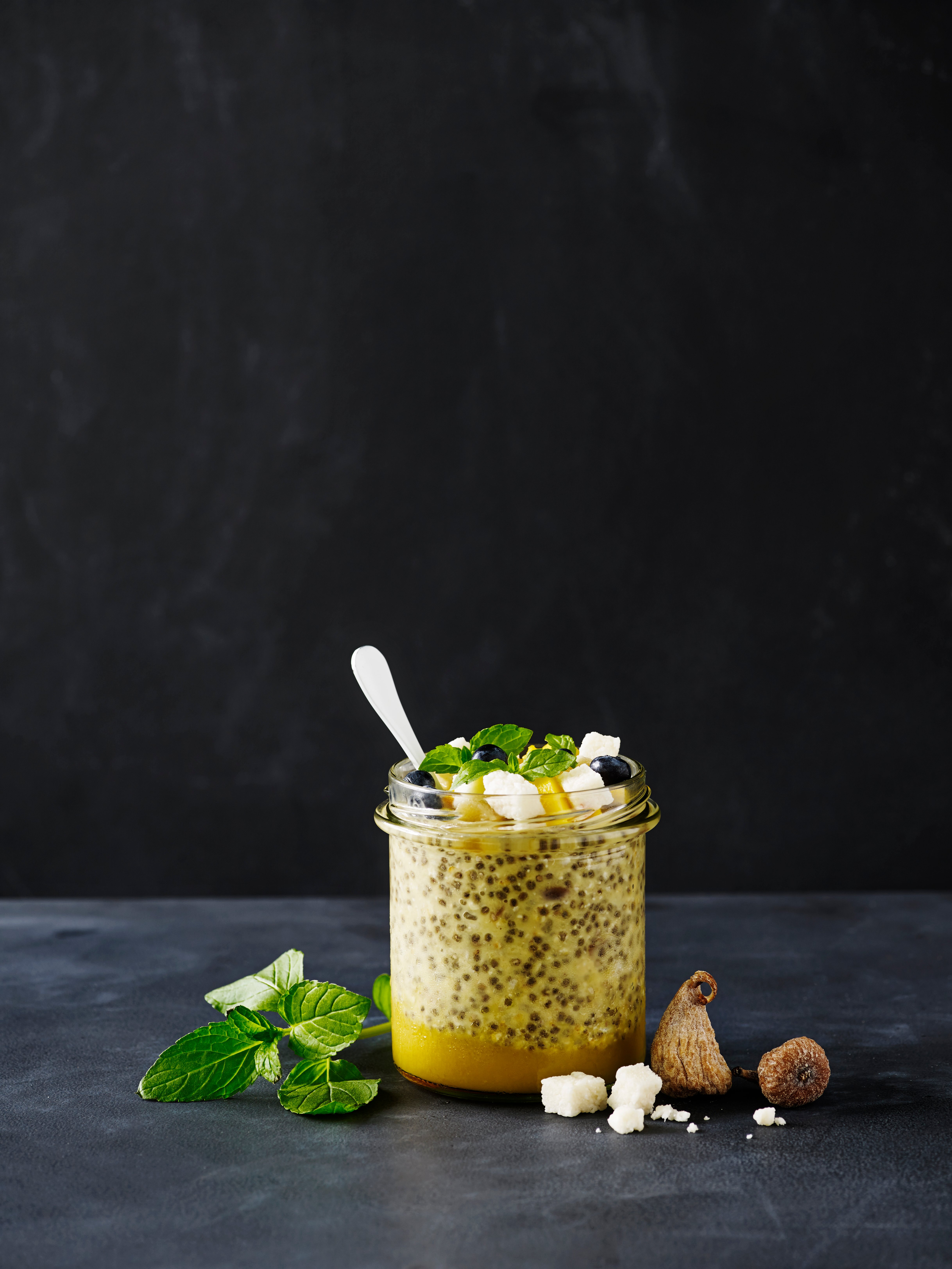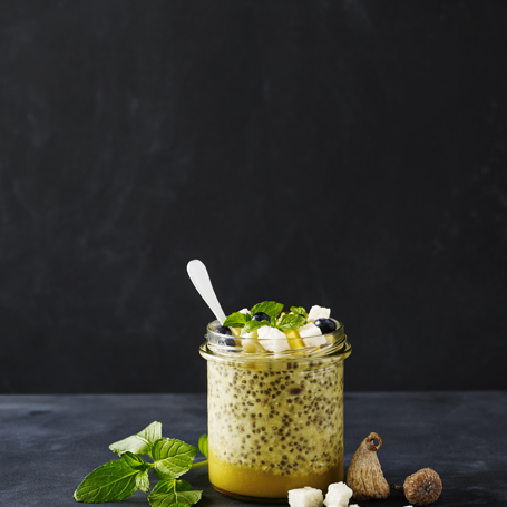 Koristele tuorepuuroannos kookoskuutioilla, tuoreilla mustikoilla ja nauti.