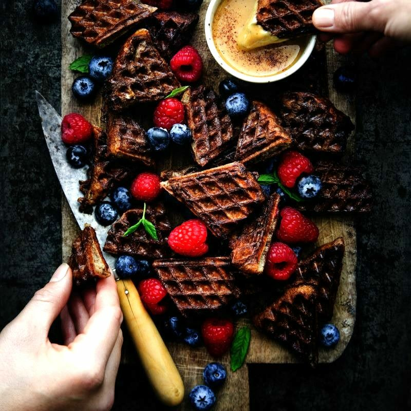 Laita vohvelirauta lämpenemään. Sekoita keskenään maito, munat, vaahterasiirappi ja kaakaojauhe sekä hyppysellinen suolaa. Kääntele ensimmäinen leipäviipale taikinassa ja anna taikinan imeytyä muutaman minuutin ajan. Voitele vohvelirauta kookosöljyllä ja laita leipäviipale sitten raudalle. Kääntele sillä välin toinen leipä taikinassa. Ritarit ovat valmiita muutamassa minuutissa, kun niiden pinta on ruskistunut kauniin kultaiseksi. Paista loputkin leipäviipaleet vohveliraudassa. Tarjoile kolmioiksi leikattuina tuoreiden marjojen ja dippailuun tarkoitetun maapähkinävoin kera.