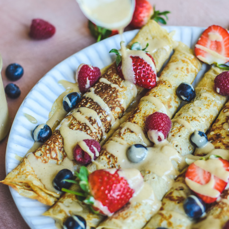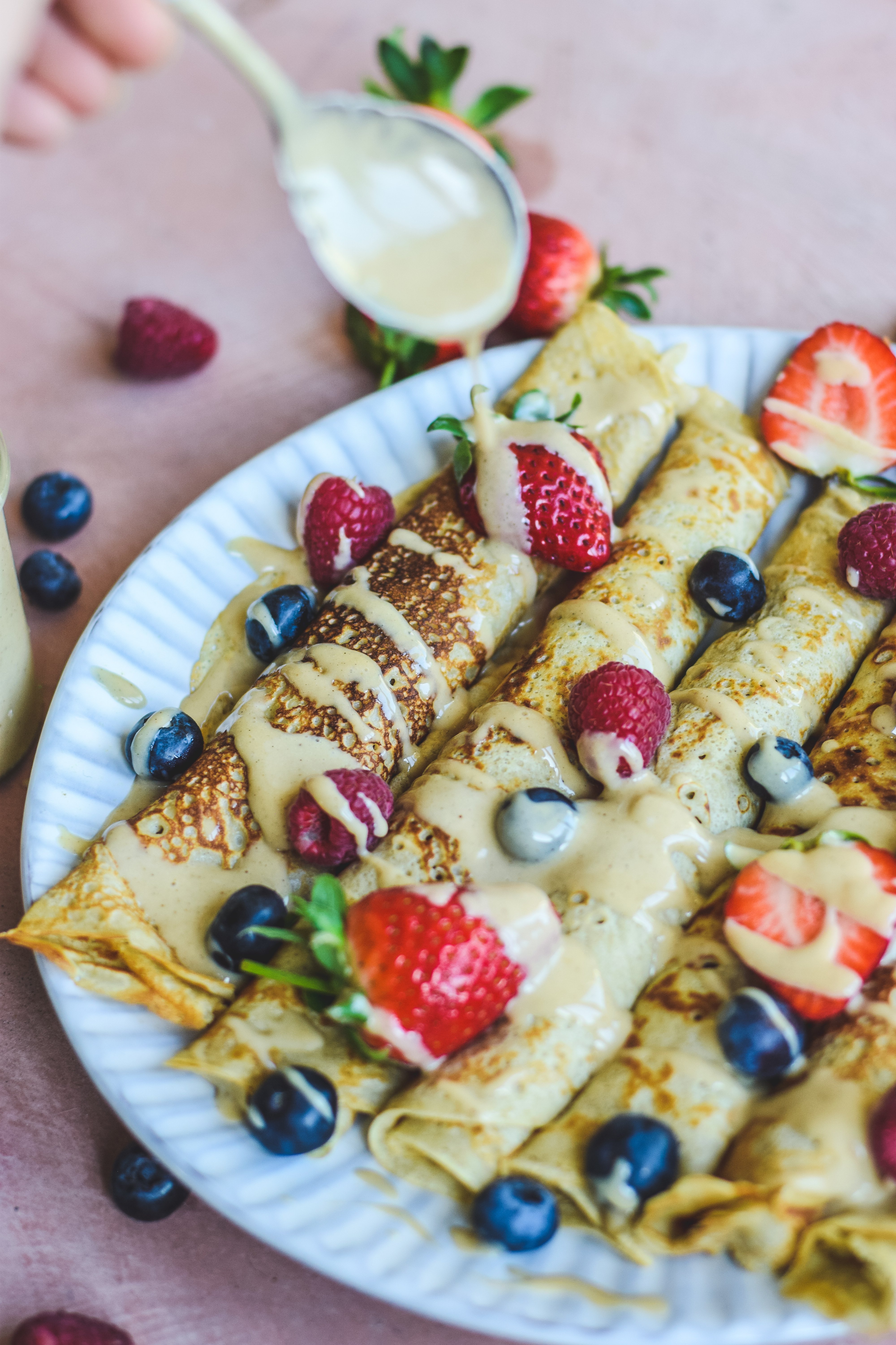 Sekoita cashewvoi, vanijajauhe ja vaahterasiirappi ja lisää maitoa vähän kerrallaan, kunnes saat kermaisen koostumuksen. Sekoita vielä koko seosta. Kaada seosta letulle ja rullaa.