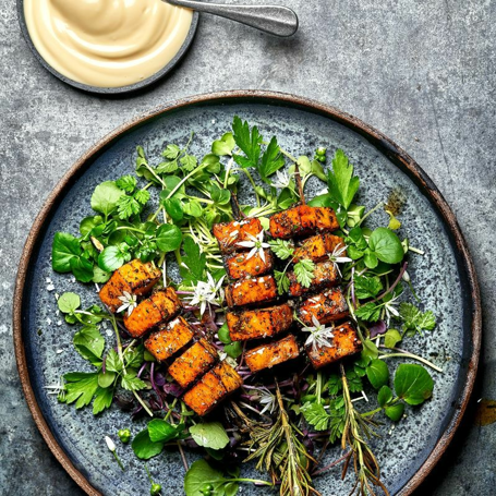 Tofua rosmariinivartaassa sekä auringonkukkaöljystä, kuivatusta oreganosta, hienonnetusta tuoreesta rosmariinista ja valkosipulista valmistettua marinadia. Tarjoillaan yrttipedillä cashewvoilla maustetun majoneesin kera