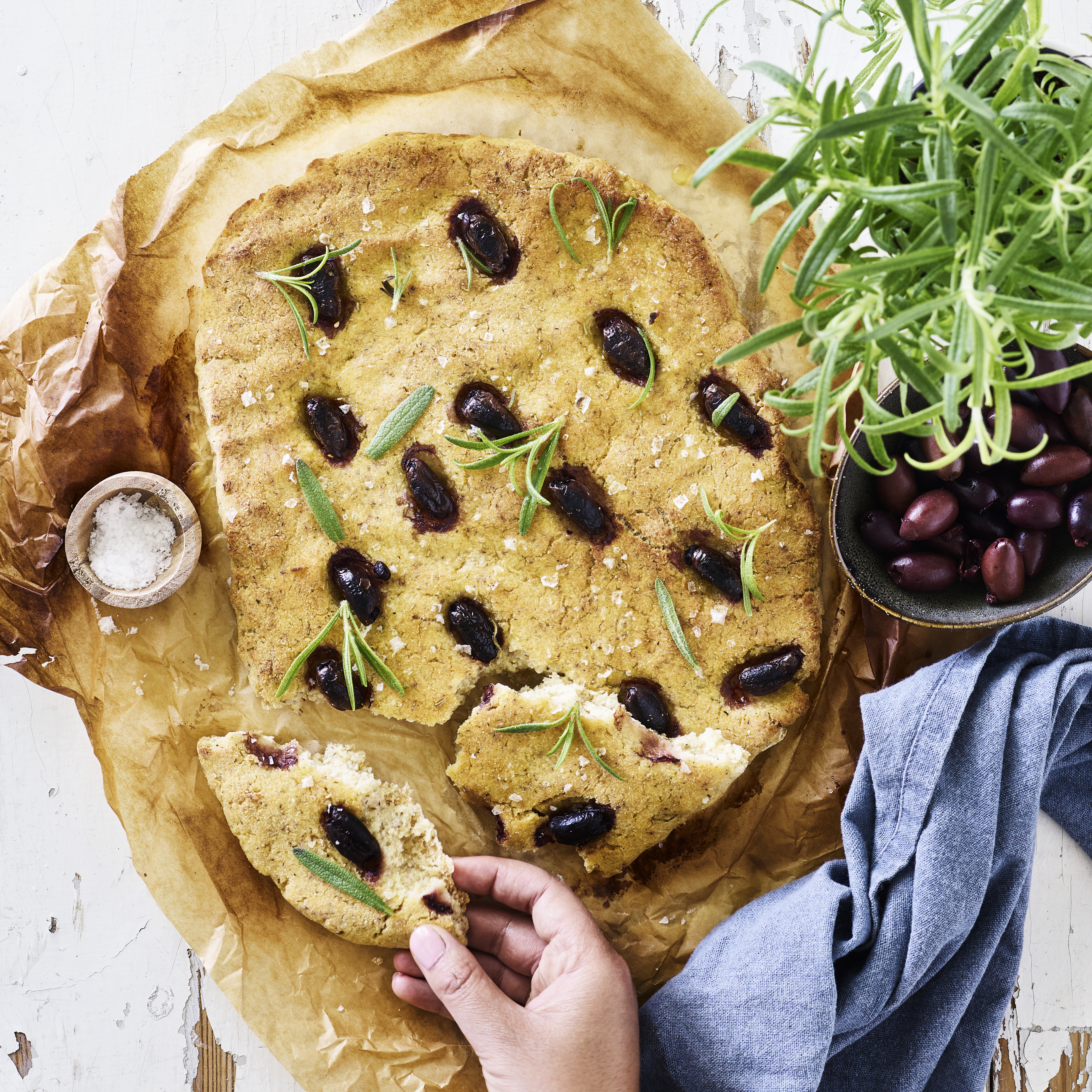 Jauhoseoksella leivot maistuvaa rosmariinilla maustettua focacciaa.