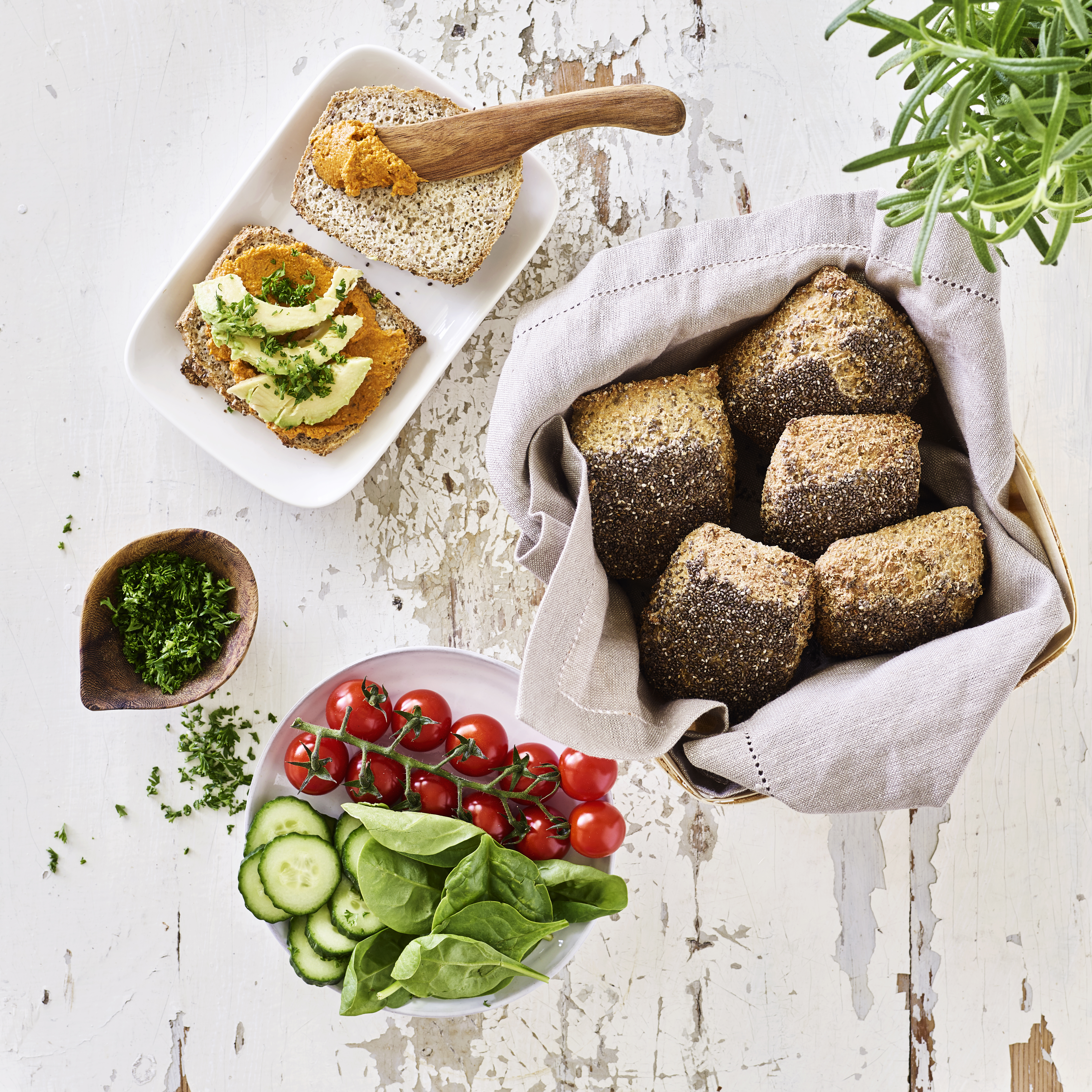 Herkulliset ja gluteenittomat chiansiemensämpylät. Sopivat niin aamiaiselle, välipalalle kuin evääksi.