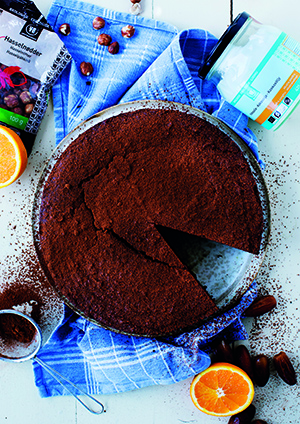 Kaada taatelit, mantelit, hasselpähkinät, banaanit, kaakaojauhe, öljy, appelsiinimehu ja -kuoret, vanilja, kaneli, suola ja pippuri monitoimikoneeseen ja käynnistä. Anna käydä muutaman minuutin, kunnes seos kerääntyy märäksi ja karkeaksi massaksi. Lisää munat monitoimikoneeseen sen käydessä 1- 2 kpl kerrallaan. Muutaman minuutin kuluttua seos on paksua, ilmavaa ja tasaista "suklaataikinaa". Kaada taikina pyöreään, voideltuun kakkuvuokaan ja paista n. 35 - 40 minuuttia 160 °C. Pidä silmällä että pinta ei pala, sen tulee olla kullanvärinen eikä saa mustua. Anna kakun jäähtyä ennen tarjoilua.