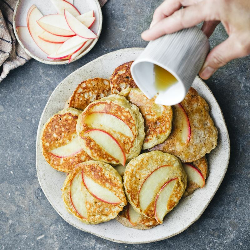 Omenapannukakut ovat paksuja amerikkalaisia banaanipannukakkuja terveellisempi gluteeniton versio, jossa banaani on korvattu omenasoseella. Nopeat pannarit maistuvat varsinkin syksyisen koleina aamuina.