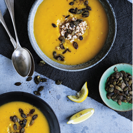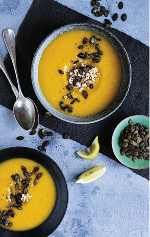 Kurpitsakeitto suolamanteleilla