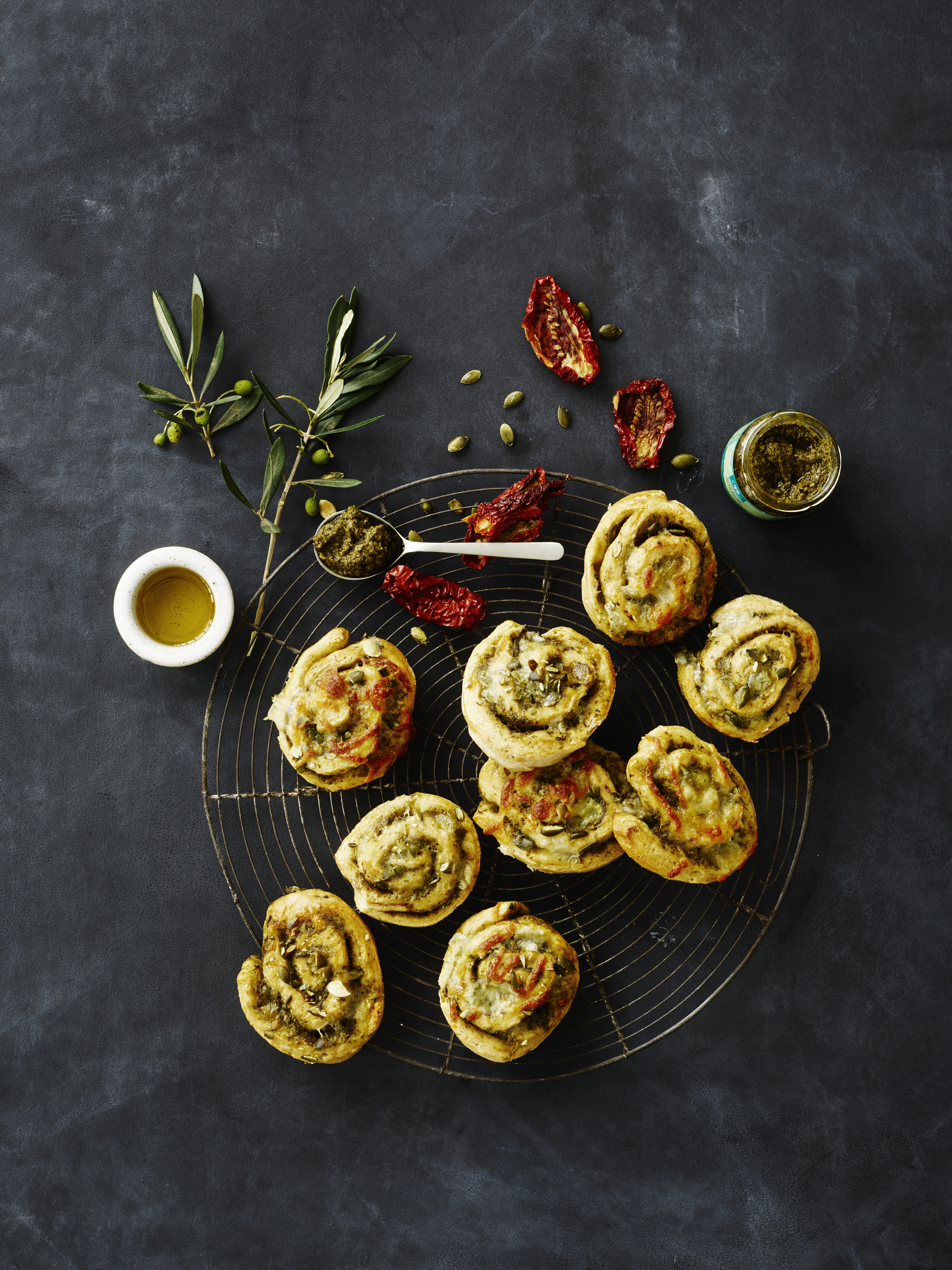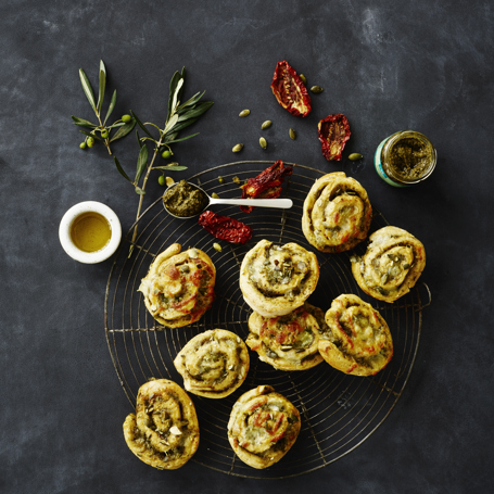 Voitele taikinalevylle kerros pestoa ja ripottele päälle paahdetut kurpitsansiemenet ja halutessasi mozzarellanpalaset ja basilikasilppu. Mausta suolalla ja pippurilla. Rullaa taikinalevy rullaksi, leikkaa se n. 2 cm paksuiksi siivuiksi ja siirrä ne pellille. Anna kohota vielä n. 30 min. Voitele hyrrät kananmunalla ja ripottele niiden pinnalle vähän durumjauhoja. Paista 200 asteessa n. 15–20 min.