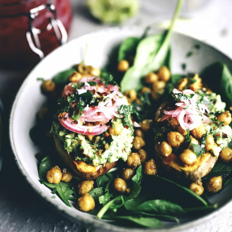 Täytä bataatit babypinaatilla, guacamolella ja kikherneillä. Lisää lopuksi päälle pikkelöityä sipulia ja tuoretta minttua.