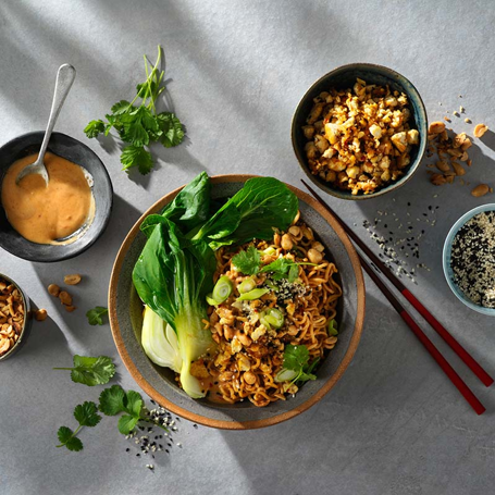 Lisää päälle kermainen kastike, rapea tofu, vihreä sipuli, korianteri ja seesaminsiemeniä.