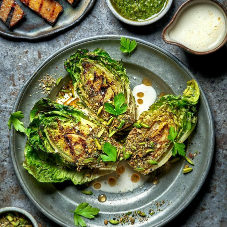 Grillattua sydänsalaattia, yrttikastiketta ja tahinikastiketta