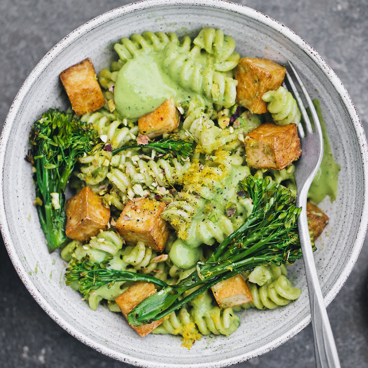 Tässä nopeassa, vegaanisessa pastaruoassa valmistat kermaisen kastikkeen sekoittamalla keskenään herneitä, sitruunaa, yrttejä ja avokadoa. Tarjoile paistetun tofun ja parsakaalin kanssa. Nopeaa, terveellistä ja herkullista!