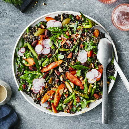 Raikas ja täyttävä salaatti, jossa parsaa, porkkanaa ja pinaattia, tahini-linssejä ja luomumanteleita.