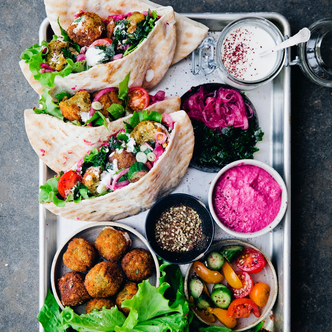 Falafel pitaleivässä on varsinainen klassikkoruoka. Tässä sen seurana tarjoillaan punajuurihummusta ja ihastuttavaa vihreää korianterikastiketta nimeltä zhoug, joka saa makunystyrät riemuitsemaan. Kiireinen kokki voi ostaa pitaleivän ja hummuksen valmiina ja valmistaa vain yrttikastikkeen itse.