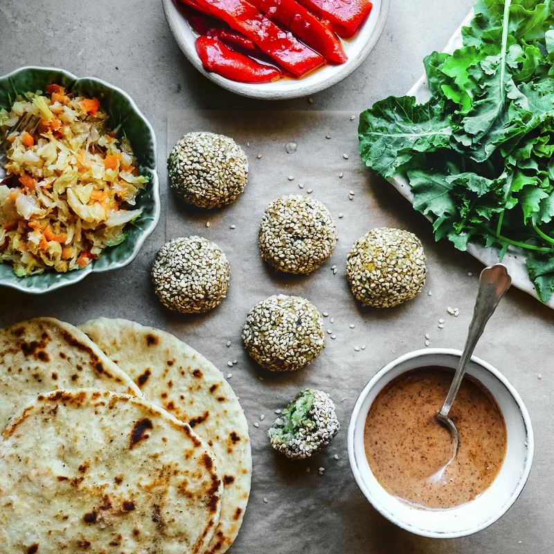 Täytä tuoreet leivät salaatilla, linssipyöryköillä, paprikalla, kimchillä ja mantelikastikkeella.