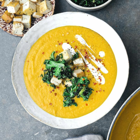 Kun vihannekset ovat pehmentyneet, sekoita keitto tasaiseksi sauvasekoittimella tai tehosekoittimella. Mausta suolalla, pippurilla ja tilkalla sitruunamehua. Jaa neljään kulhoon, lisää päälle lehtikaalia ja tofua ja tarjoile.