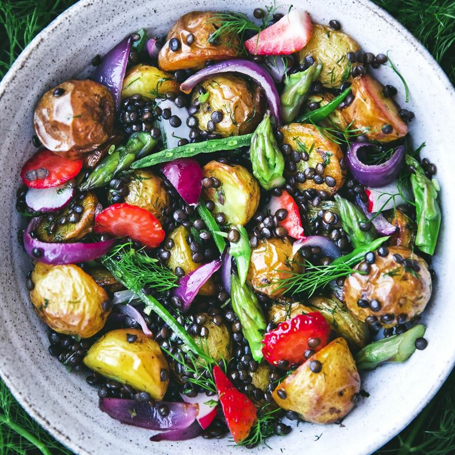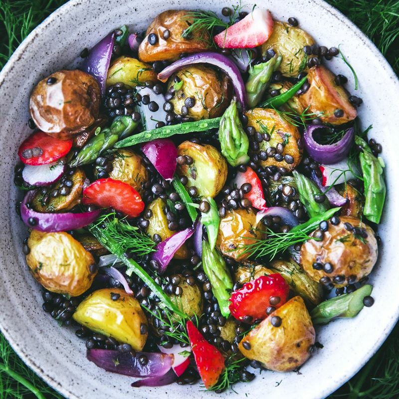 Kaada linssit, perunat ja punasipuli isoon kulhoon, ja kaada vinegrette päälle ja sekoita kunnes kaikki on vinegreten peitossa. Asettele päälle parsa, retiisit ja mansikat ja ripottele päälle tilli.