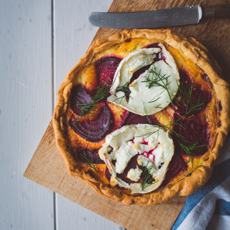 Punajuuripiiras spelttijauhoista, höystetty tahinilla