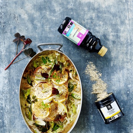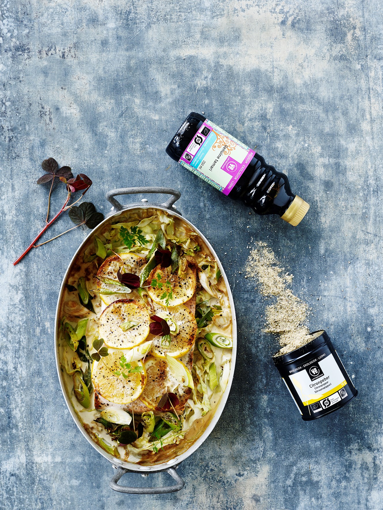 Kuumenna uuni 200-asteeseen (tasalämpö). Hienonna ja huuhtele suippokaali, hienonna kevätsipulit ja leikkaa sitruuna ohuiksi viipaleiksi. Levitä suippokaali ja kevätsipuli uunivuoan pohjalle, aseta lohifileet päälle ja laita jokaisen lohifileen pinnalle kaksi sitruunaviipaletta. Ripottele päälle sitruunapippuria ja suolaa. Kaada vuokaan lopuksi tamari ja kerma. Paista n. 15–20 minuuttia. Tarjoile heti. Lisukkeeksi sopii esim. rouhea leipä.