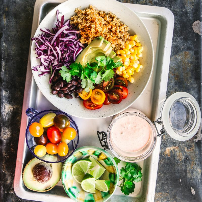 Pilko kaikki vihannekset ja jaa kahteen kulhoon yhdessä paistetun kvinoan ja mustien papujen kanssa.