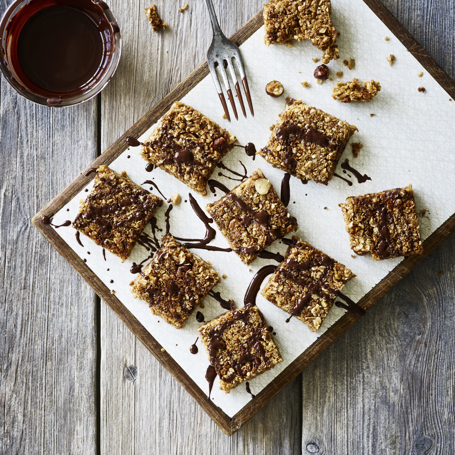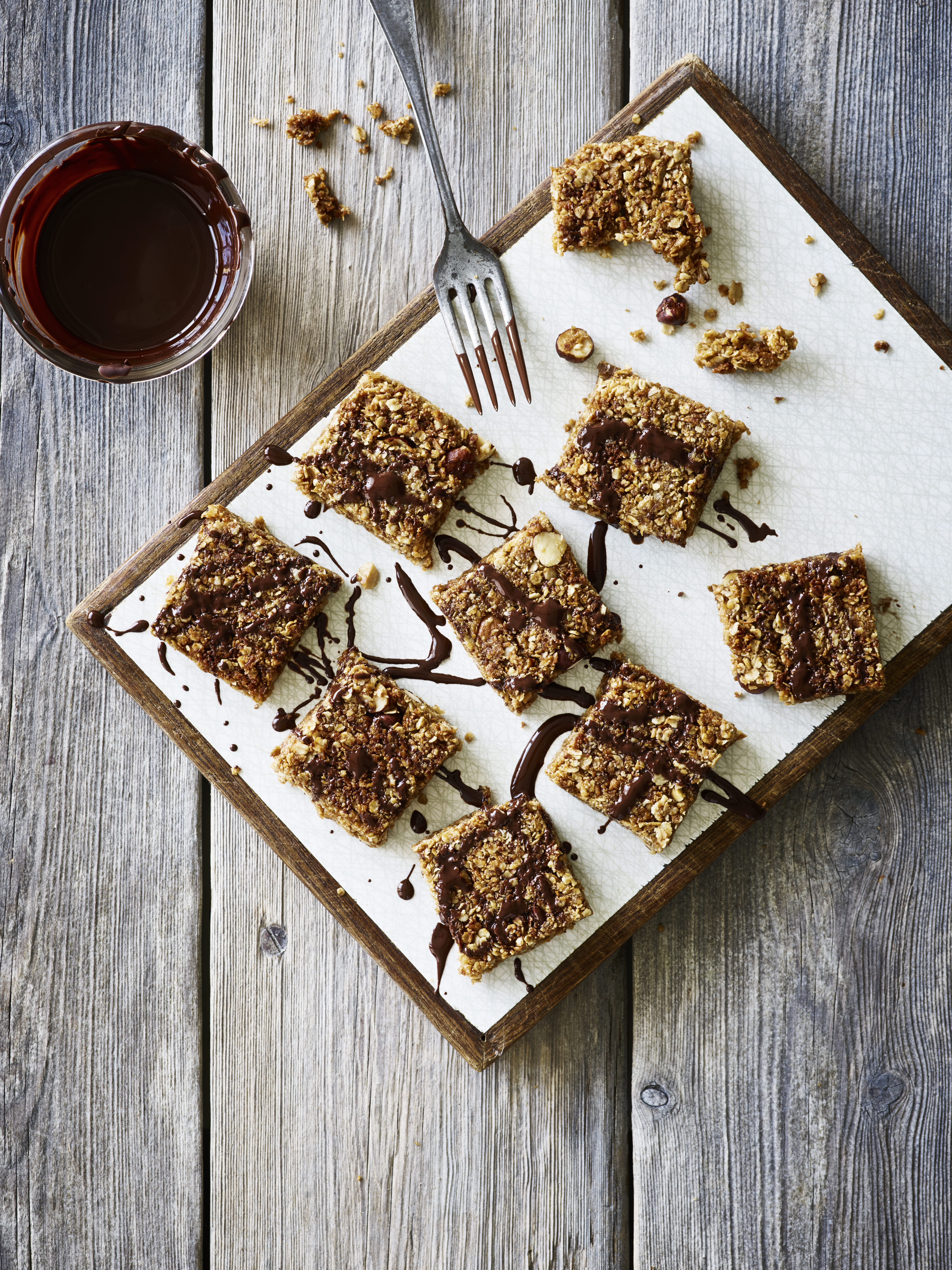 Sulata miedolla lämmöllä öljy, sokerit ja siirappi kattilassa. Sekoita kaurahiutaleet, jauhot, pähkinämurska ja suola erillisessä kulhossa ja yhdistä öljy-sokeriseokseen. Sekoita massa tasaiseksi seokseksi ja kaada vuoratulle vuoalle. Painele seos tiiviiksi levyksi vuoan pohjalle.